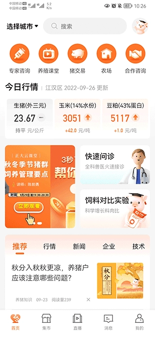 1、打开正大猪博士,用户在首页能够查询当日行情,还可使用快速问诊、专家咨询等服务