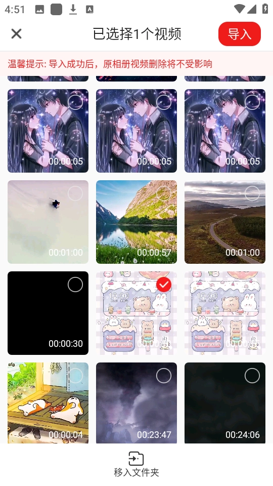 3、任意选择一个视频内容,点击“导入”。