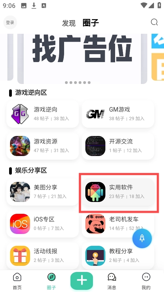 3、进入圈子页面后,找到“实用软件”板块并点击,查看其中的精选应用推荐内容。