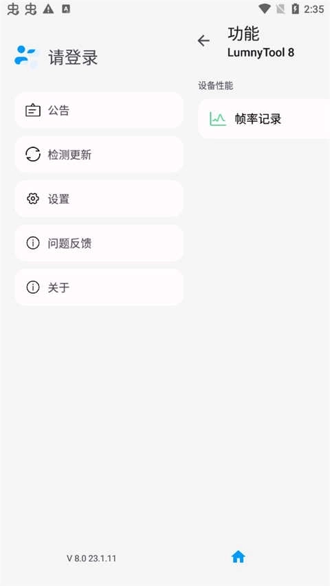 5.点击【功能】选项,即可看到【帧率记录】与【免Root锁定画质】这两个功能选项。