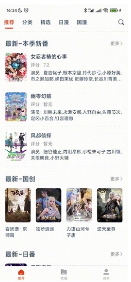 1、打开后,首页呈现的是推荐资源页面,在这里能看到本季新番、最新国漫、最新日番、最新剧场动漫等各类资源,所推荐的均为近期播出的新内容以及当下较为热门的作品。