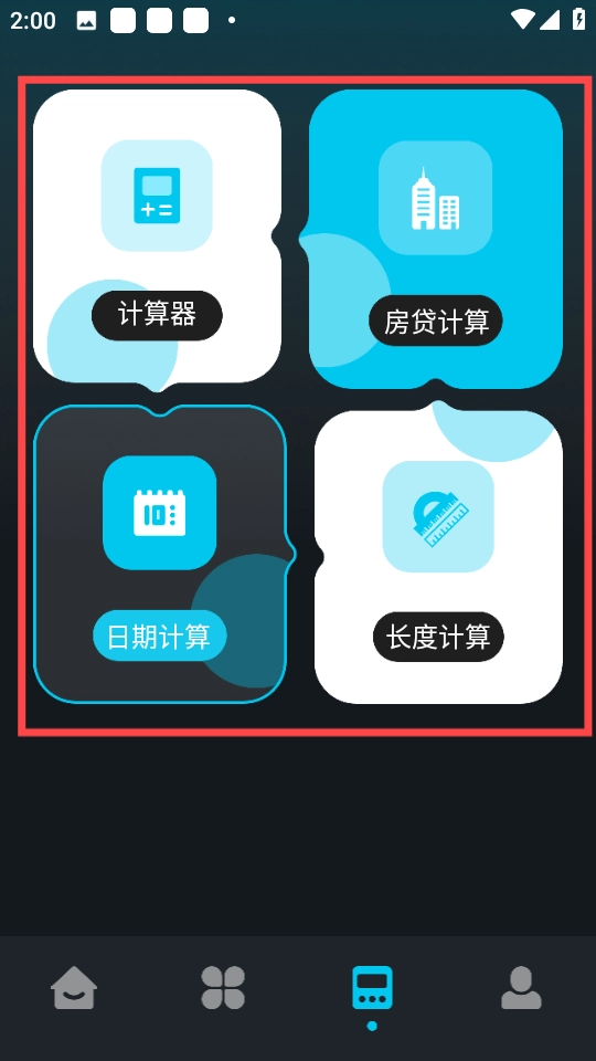 4、点击下方的图标后,我们能够看到计算器、房贷计算、长度计算等功能。