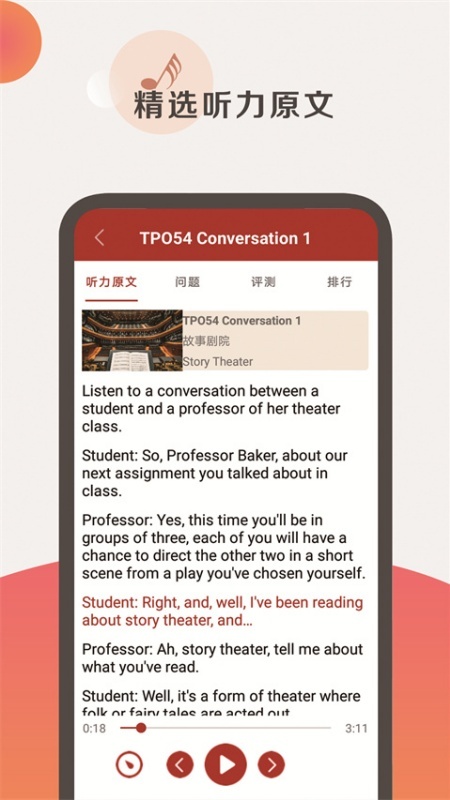 1、【题库】:69套最新TPO听力,囊括各类题型。我们设有泛听、精听模式,句子能够反复聆听。完成听力后即可开展强化训练,还有专业解析,为考生答疑解惑。