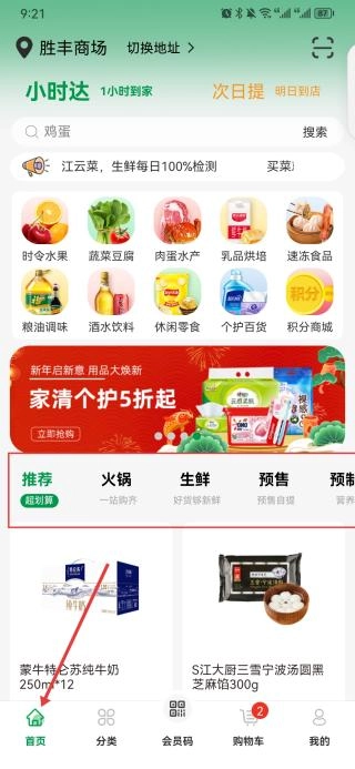 1. 在【首页】选择小时达或次日提选项,依据分类查找商品,实现快速购菜。
