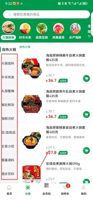 2. 进入【分类】页面,点击火锅专区,从中挑选自热火锅、底料等商品,根据自身需求进行加购。