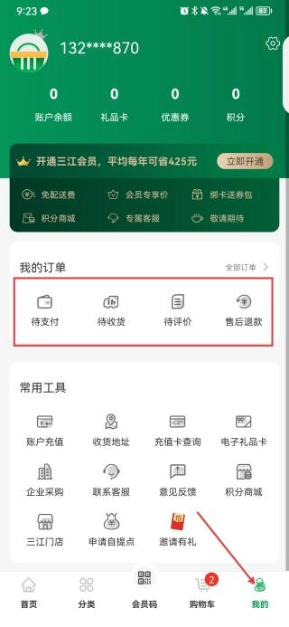 3、点击【我的】,在这里你可以查看订单状态,包括待支付、收货等情况。同时,还能使用常用工具,比如账户充值等功能。不仅如此,你还能够开通会员,享受会员专属权益。
