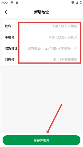 4、于新增地址页面,依次填写【姓名】、【手机号】、【收货地址】、【门牌号】,随后点击【保存并使用】便可。
