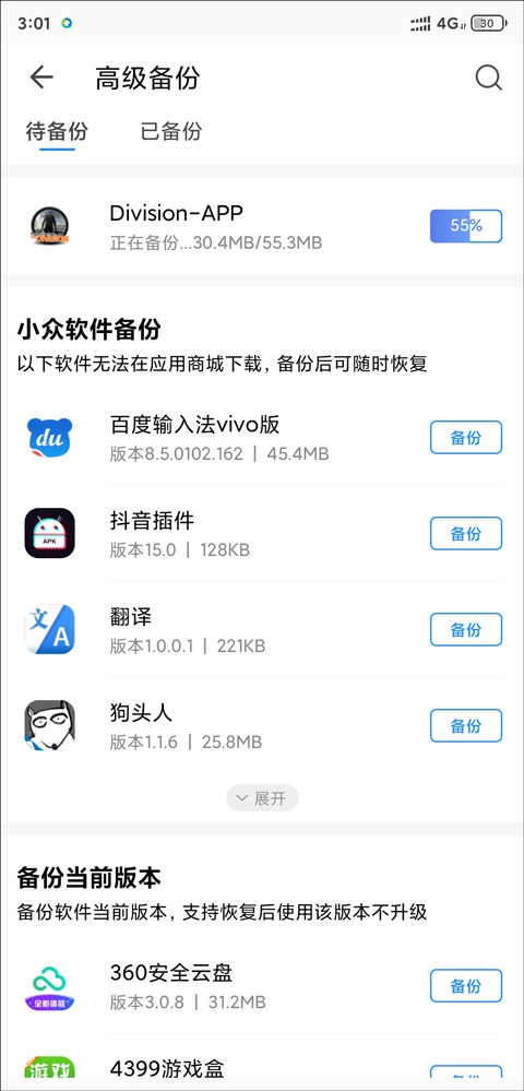 3、所有待备份软件的右侧都有一项“备份”,单击以后就开始备份了,而且应用还自动将小众软件单独列出来;
