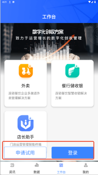 3、在数据与工作台界面,能够点击申请试用或者登录。