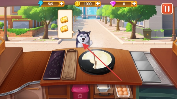 3、在制作台,按提示如哈士奇需求 ,制作早餐煎饼等 ,满足顾客,赚取金币,升级店铺。