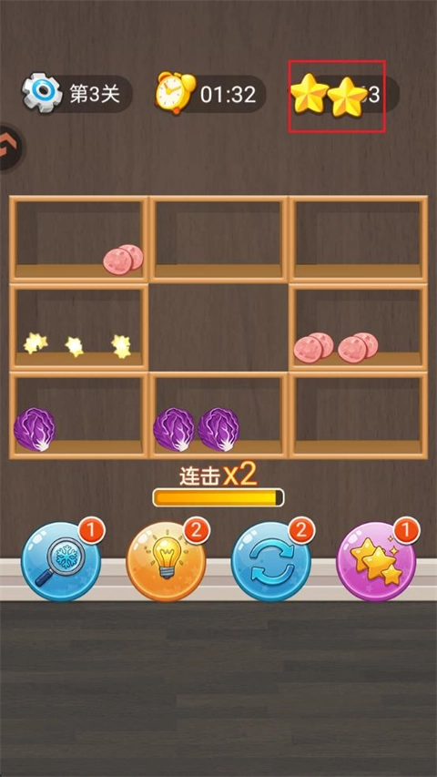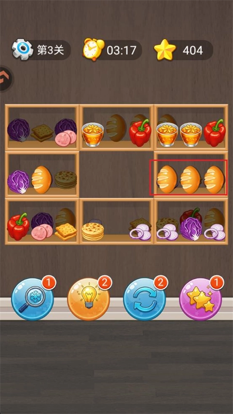 1. 进入游戏之后,要在数量有限的收纳格内,把三种一样的食材连在一起组成一组来实现消除。