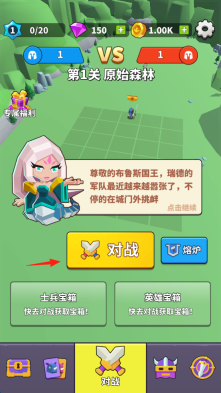 1. 点击标有红箭头的【对战】,从而进入第1关“原始森林”,接着指挥蓝色的士兵,去迎战雷德军队。
