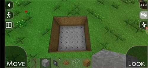 2、首先挖一个大小随意的坑,这里用5×5的作为演示,往下挖四格以后再最底下一层铺上穿线石。