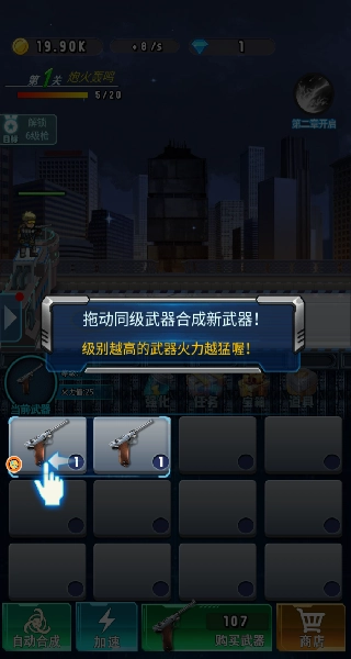2、根据操作界面上的指示,将相同的武器拖动到一起,合成更高级的武器。