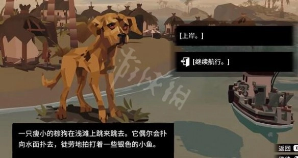 在岸边航行的时候会遇到一条瘦小的棕狗。