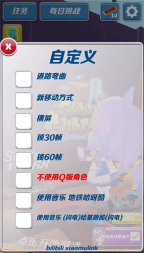 2、与此同时,你能够依据自身的需求,在自定义板块中开展不同的设置。不仅支持选用呈正比例的东海帝王形象来进行跑酷,而且还能够勾选勾式背景音乐来进行游戏。