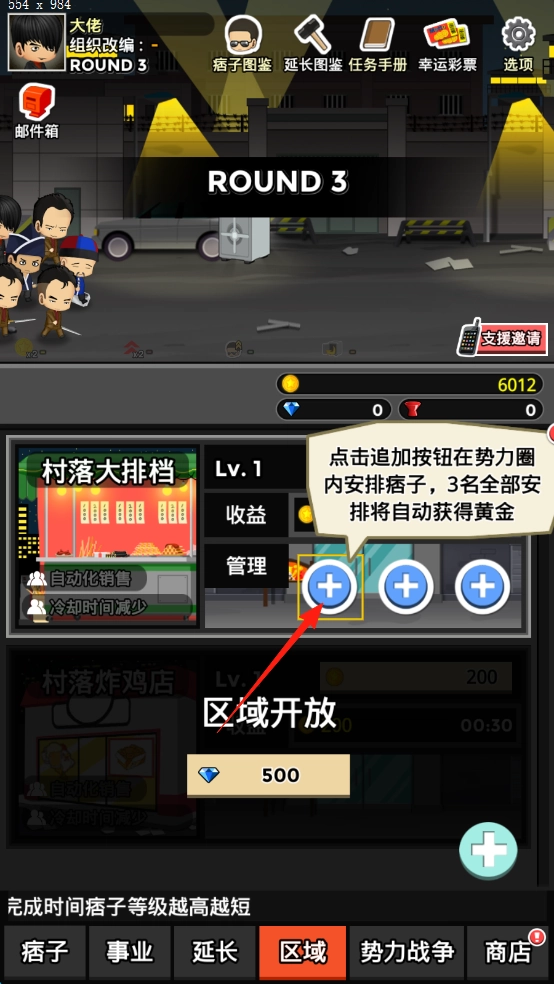 2、进入区域界面,点击追加,安排痞子,管理产业,获取黄金收益。
