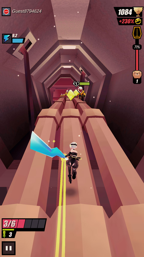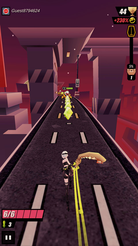 既然这款游戏旨在追求极致的爽快感,那当前的表现显然是不达标的。必须强化前期的爽快感与刺激感,如此才能赋予玩家深入游玩的动力。举例来讲,可以加快某些速度;或者在玩家一出门时,地上就出现一个道具,拾取后就能加速,同时进入无敌模式,左右划动角色不仅会砍空气,还能进一步加速,遇到障碍物也可将其全部破坏,在效果呈现上不妨做得夸张些,持续时长大约10秒。只有先让用户兴奋起来,他们才能够切实体验到游戏的乐趣。