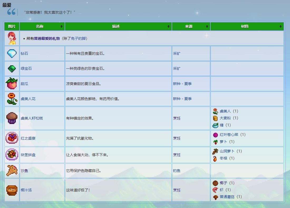 一、最钟爱的礼物:钻石、绿宝石、甜瓜、虞美人花、虞美人籽松糕、红之盛宴、块茎拼盘、沙鱼、椰汁汤、五彩碎片、珍珠、黄金南瓜、魔法糖冰棍。