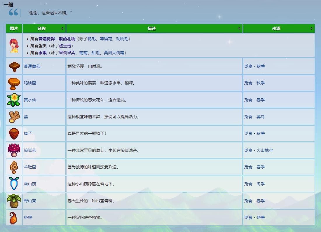 三、普通礼物:包含普通蘑菇、鸡油菌、黄水仙、姜、榛子、熔岩菇、羊肚菌、雪山药、野山葵、冬根,部分水果,除虚空蛋外的各类蛋类,还有那些NPC喜好程度大多为一般的礼物。