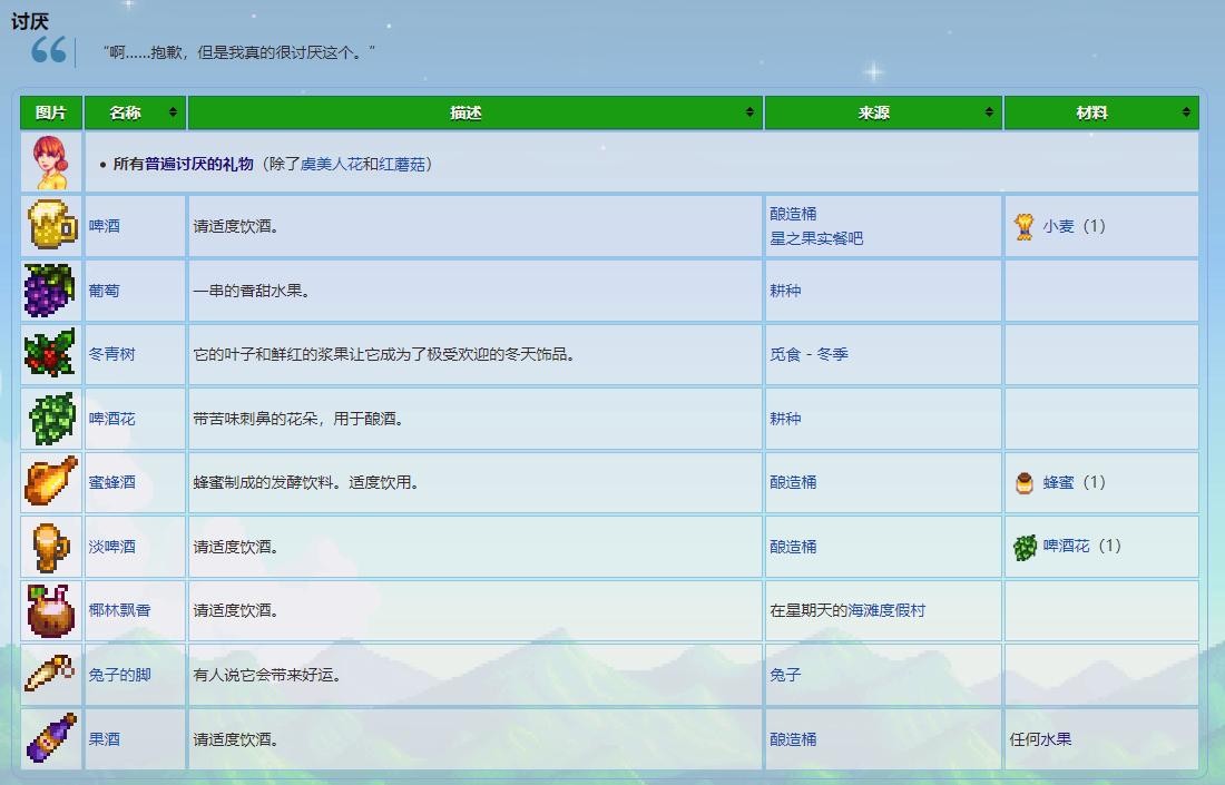 五、不受欢迎的礼物:啤酒、葡萄、青树、啤酒花、蜜蜂酒、淡啤酒、椰林飘香、兔子的脚、果酒,还有虫肉块、鲤鱼、铜矿石、龙牙等这类NPC大多讨厌的礼物。