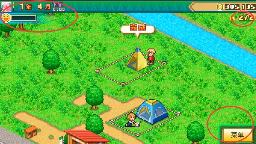 2. 在画面的左上角,会标注露营地的运营天数。若轻轻点击笑脸标志,就能查看访客的满意度。而通过菜单键,则可以对设施进行管理,或者退出游戏。