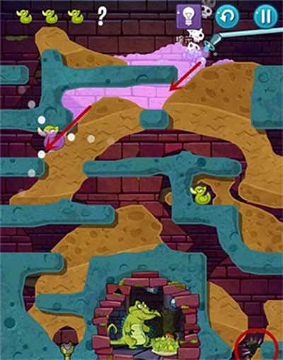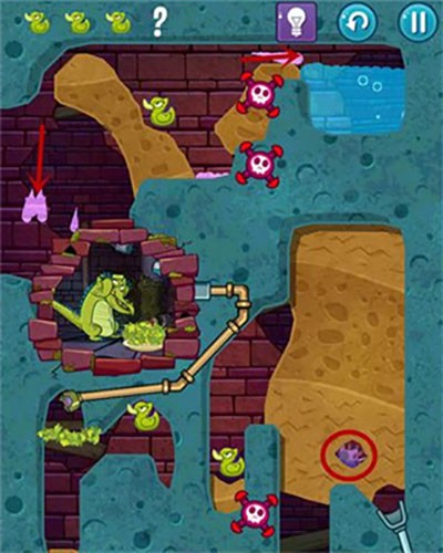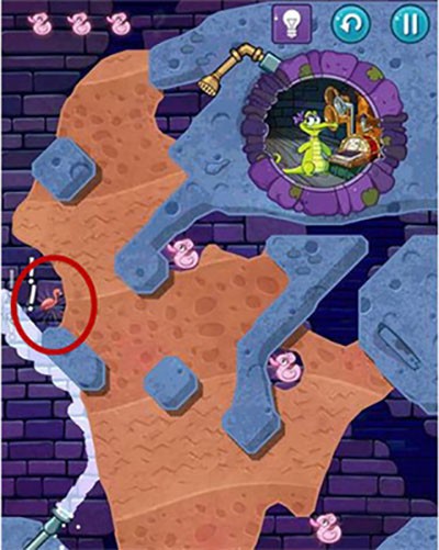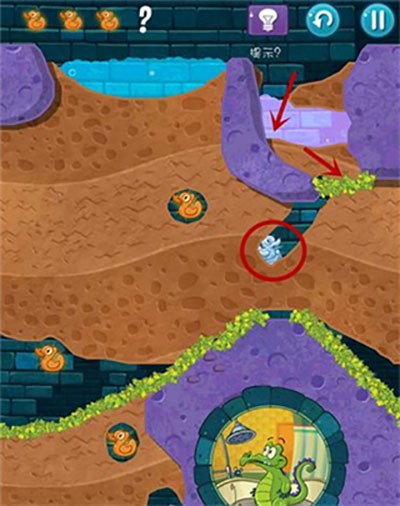2、在本关中,第一步是在通往上方一只鸭子的路径上划开道路,并开启红色水闸的开关。接下来,泥浆接触到青草后会转变为石头。