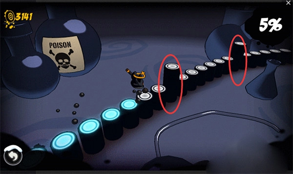 3、注意啦,要是天上出现那种红色障碍物,玩家千万别在前一格点击跳跃,不然小墨点会被扎到。