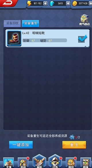装备回收功能能够对装备进行回收操作,在完成装备回收后,玩家可获取一定数量的金币与勇气币。而装备重生则是通过消耗装备重生石,对已培养的装备进行回收处理,进而返还所有的养成资源。