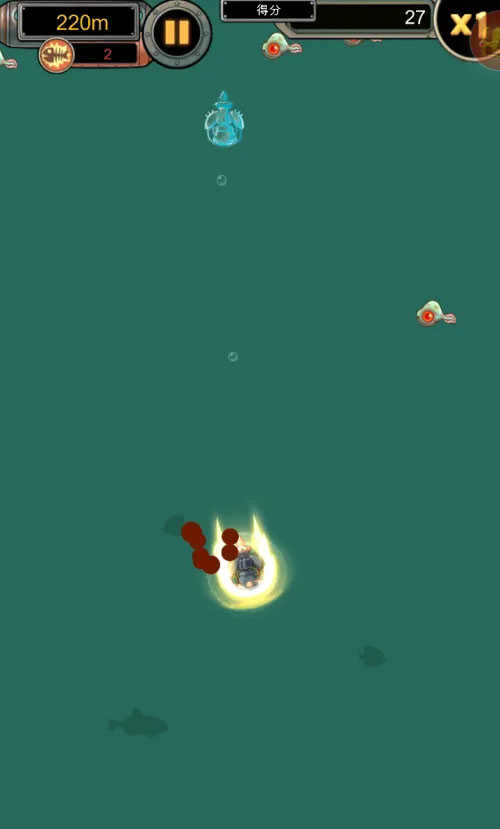 2、游戏一开始,玩家就得操控弹丸下潜,同时要避免被魔鱼碰到。然而,当弹丸下潜到底后,玩家必须迅速改变操作思路。