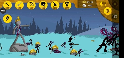 待敌人出现后,操控矛兵,安排矿工撤离,指挥城堡弓兵射击。你只需手持盾牌吸引敌方伤害,确保敌人不会攻击雕像。