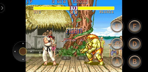 1. 开启街头霸王2汉化版的手机版本,首先轻点“投币”,接着点击“开始”。