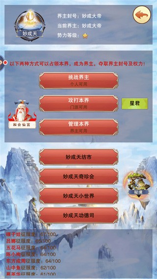 在凡间之上存在三界,分别是33天界、19地狱以及15魔界,总共67个小世界。每个小世界都设有各自的界主,而且这些世界还有星级之分。所有玩家都能够参与界主的争夺,挑战成功便能获取征服度,只有当征服度达到满值时才可以成为界主。界主进度的计算方式为:世界星级×100。举例来说,一星的梵度天需要100进度,九星的玉皇天则需要900进度。