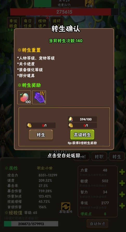 当游戏成功通关100关,就能获取转生证明。完成转生后,可得到当前难度下的通关证明。若花费100彩钻,转生奖励将乘以3 。要是拥有宠物变异亡灵骑士(需20转解锁),还能额外增加1(此效果无法叠加)。