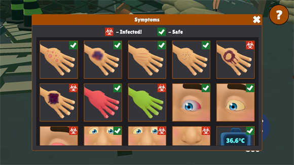2、若想查看被感染的症状,可点击右上角的问号按钮,借助这些症状就能判断出哪些人被丧尸感染了。