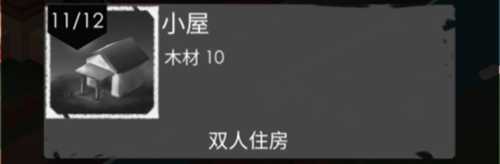 建造小屋需耗费10木材。工人能够在小屋里休憩,以恢复精力。要是没有小屋可住,工人就只能在篝火边休息,然而在篝火边休息不仅无法恢复精力,还可能在夜晚遭遇怪物的袭击。而在小屋中休息则可躲避怪物。建造充足的小屋有利于降低工人的损失,并且小屋后续还能升级,每个小屋最多容纳5人居住。