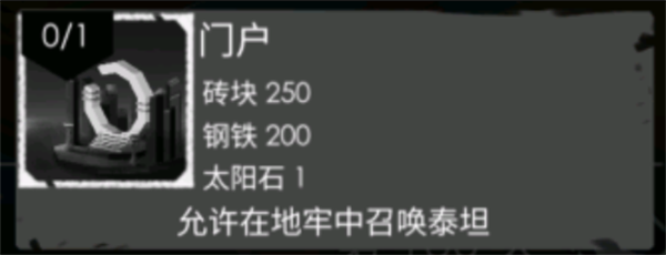 建造门户的前置条件与学院、泰坦锻造厂相同,探索者在建造门户前,同样需要先拥有[太阳动力锻造],即我们熟悉的泰坦祭坛。由于门户需要强大魔力才能将泰坦召唤至地牢,所以它所需材料在三者中是最多的,具体为:砖块*250、钢铁*200、太阳石*1 。