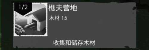 建造樵夫营地需消耗15木材。在樵夫营地内,玩家能够安排两位工人转变为木匠。木匠会砍伐营地周边的树木,并将木材存储于樵夫营地中。这些木材既能够用来制作一些木质生活工具,也可用于部分建筑的升级。樵夫营地主要用于储存木材资源,当储存空间已满时,玩家便可以对樵夫营地进行升级,其最高可升级至3级。