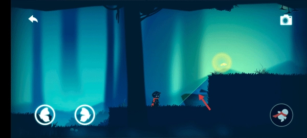 3、当艾瑞尔遇到特别高的台阶,跳跃按钮无法帮助通过时,按照新手引导点击屏幕,让蝴蝶停在点击的位置,此时会出现一条可向上行走的路径,后续若再碰到特别高的台阶,操作方式相同。