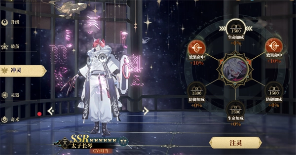 根据太子长琴的技能特性,首先确定他的出手顺序,应该是中高速出手(在敌我双方输出位之前),在对方输出位之前,选择二技能出手封印敌方的被动技能和灵器技能(在灵气和乐符足够的情况下),或者是普攻扣除敌方灵气让敌方没有灵气可用;最重要的是要有足够的效果命中保证技能封印的命中概率,其次是速度和效果抵抗,保证出手次序, 最后是提升自身生存能力,在冲灵部位有两个优先冲灵的关键属性。