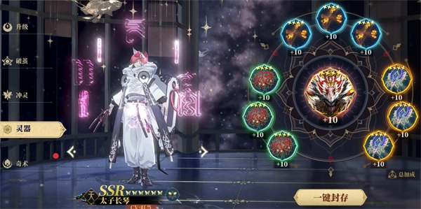 繁弦和乐:太子长琴攻击敌方全体,概率封印敌方目标的灵器技能与被动技能,升级增加封印基础概率,消耗30灵气;4级技能延长封印回合,5级技能概率吸收敌方灵气,是两个提升显著的技能等级。