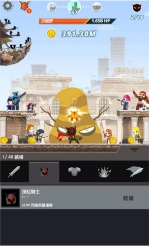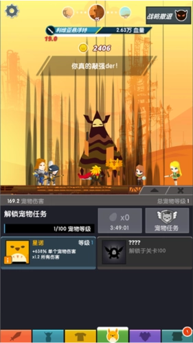 除此之外,进入游戏体验片刻便会留意到下方的菜单栏发生了变化——从原先的4个增至现在的6个。除了保留之前的主角栏、雇用英雄栏、神器栏和商店外,此次新增了装备栏与宠物栏。可别小瞧这两个新增的选项,它们为游戏的成长系统增添了新的维度,也让游戏更具可玩性:装备不仅能改变主角的外观装扮,还能切实提升角色的实力。