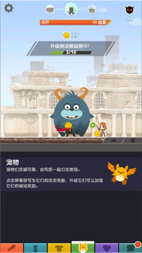 点按屏幕上的对应按钮就能给宠物充能,充能完成后它们就会对泰坦发起强力攻击,造成高额伤害。游戏过程里你会时不时得到宠物蛋,一定要好好利用这些宠物蛋助力战斗哦!