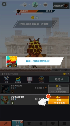玩家在游戏里也能雇佣其他英雄协助战斗。只需点击屏幕左下角的蓝色图标,就能进入英雄界面,消耗金币就能解锁英雄。被雇佣的英雄会自动攻击泰坦,不需要玩家手动点击,它们会依据自身等级来输出伤害。