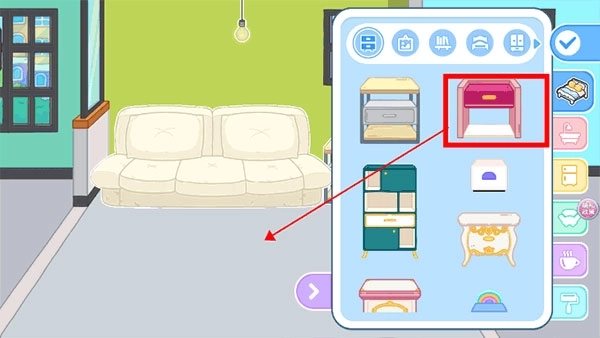 1、开始室内布置时,只需用手指长按所需家具或装饰品,并将其拖动至理想位置即可完成摆放。