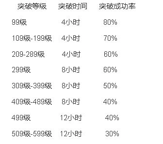 每个突破等级都对应着特定的突破时间与突破成功率,这一点和武学类型没有关联。