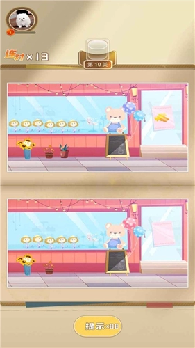 玩家需在限定时间内找出两张图片的差异。游戏采用简洁画风,设有多个关卡等待玩家挑战。
