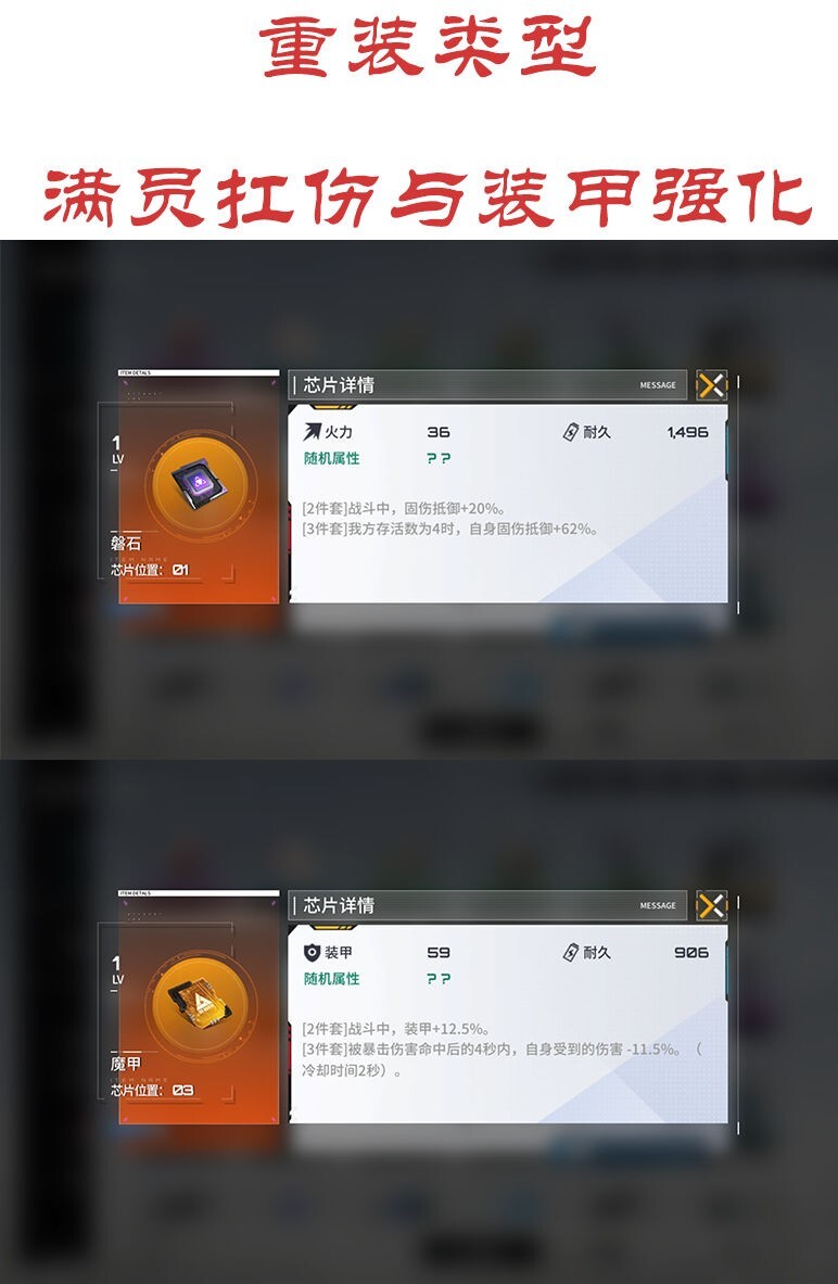 芯片的属性由2条主属性与4条随机属性共同组成。当获取芯片时,会随机生成1至4条随机属性。芯片每强化5级,就会随机提升某一条随机属性,或者新增一条随机属性。(芯片所处位置不一样,主属性也不同,具体为:01位置是火力与耐久,02位置是装甲与火力,03位置是装甲与耐久;在前期,无需过度在意随机属性,而是要重点关注套装效果。)