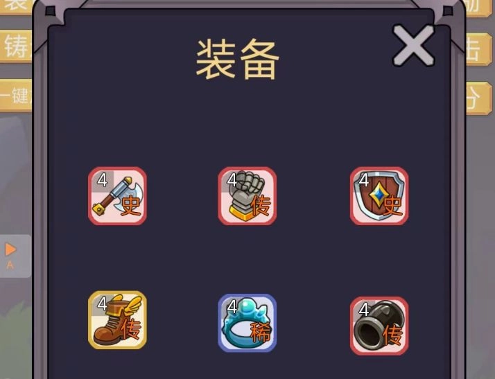 如上图所示,当前装备栏一共有6个位置,对应的装备分别是战斧、拳套、盾牌、鞋子、戒指和手腕套。