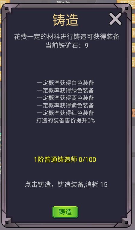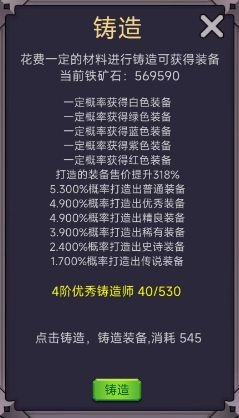 每次进行锻造操作,都能提升铸造师的等级;随着铸造师等级的提高,便能够铸造出从普通、优良到传说等不同品质的装备。